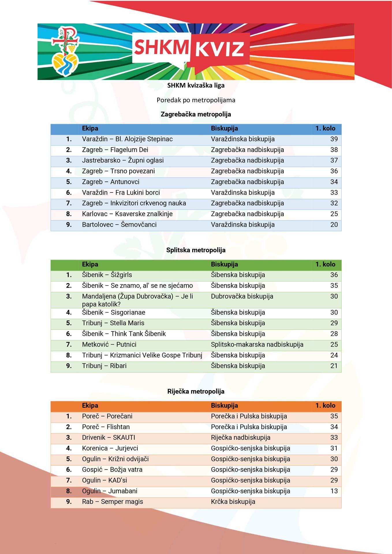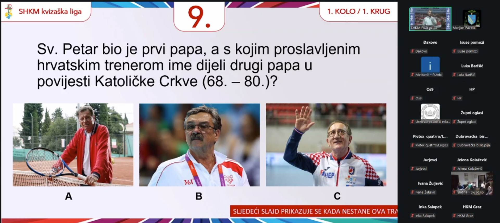U srijedu 19. studenoga, održano je prvo kolo SHKM kvizaške lige, koje je okupilo 57 ekipa, odnosno gotovo 300 mladih iz brojnih župa i zajednica diljem Hrvatske, Bosne i Hercegovine te inozemstva. Natjecanje je održano putem platforme Zoom, a vodio ga je profesor Miroslav Paulić. Kviz se sastojao od dva kruga po dvadeset pitanja, raspoređenih u više tematskih kategorija, a pripravio ga je Antun Akšamović.