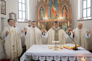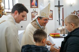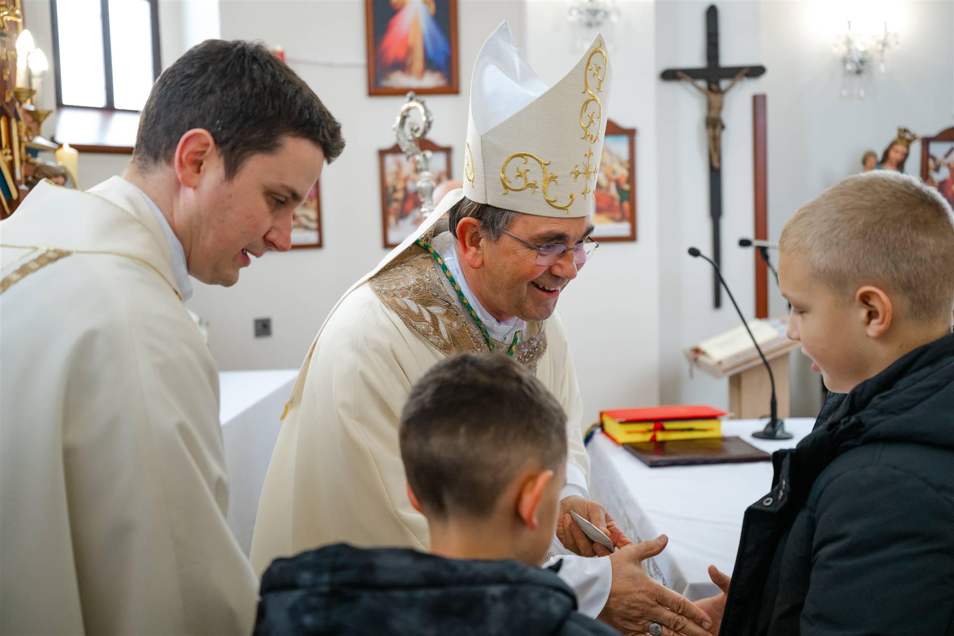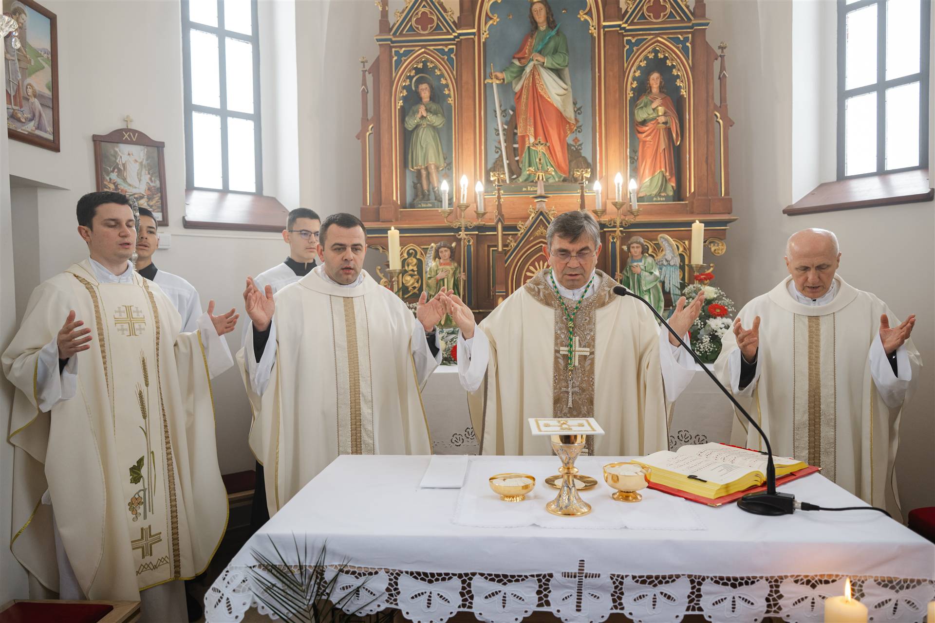 Na početku mise biskupa su pozdravila djeca u ime Župe. Zahvaljujući im i pozdravljajući sve prisutne, biskup Ivo je rekao da su se okupili da Bogu daruju novu kapelu. „Zato ga ponizno zamolimo da bude uz nas svojom milošću te svojom silom blagoslovi ovu vodu. Njome ćemo se poškropiti u znak pokore i spomena krštenja. Njome ćemo također blagosloviti stijene obnovljene kapele, a sada dozovimo si u pamet ovo: kad nas vjera i ljubav povezuju u jedno, mi smo ta živa Crkva poslana u svijet da budemo znak i svjedočanstvo one ljubavi kojom Bog ljubi sve ljude“, poručio je.