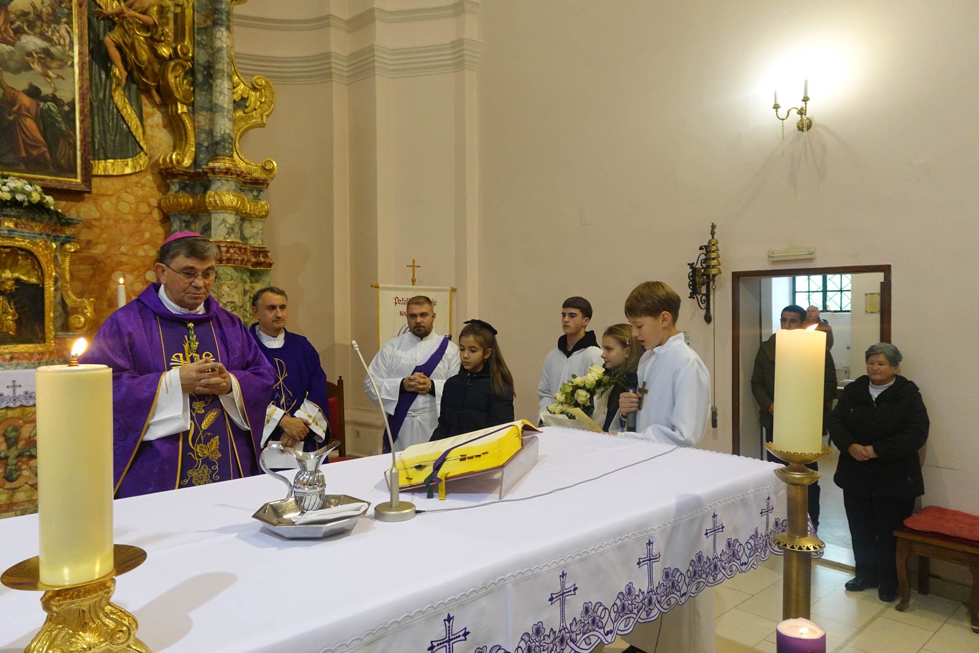 Na početku euharistijskog slavlja, biskup Ivo je pozdravio sve okupljene rekavši kako je u duhu ulazne pjesme „potrebno tražiti od Boga pomoć da nas jača, krijepi, pomaže, da svoju vjeru živimo i svjedočimo te s njim idemo u susret ne samo Božiću, nego i prema vječnosti. Potrebno je tražiti Boga jer s njim možemo nositi stvarnost svoga života, odgovoriti na izazove svijeta i našeg vremena. Njegova blizina nas jača i obnavlja da živimo kao djeca Božja. To je radost i ljubav koju nam Gospodin daje, a u ovom svetom slavlju želimo posebno moliti Gospodina da nas sve ojača u vjeri, a malog Bartola neka ispuni milošću i Duhom Svetim kako bi živio kao dijete Božje“, poručio je.