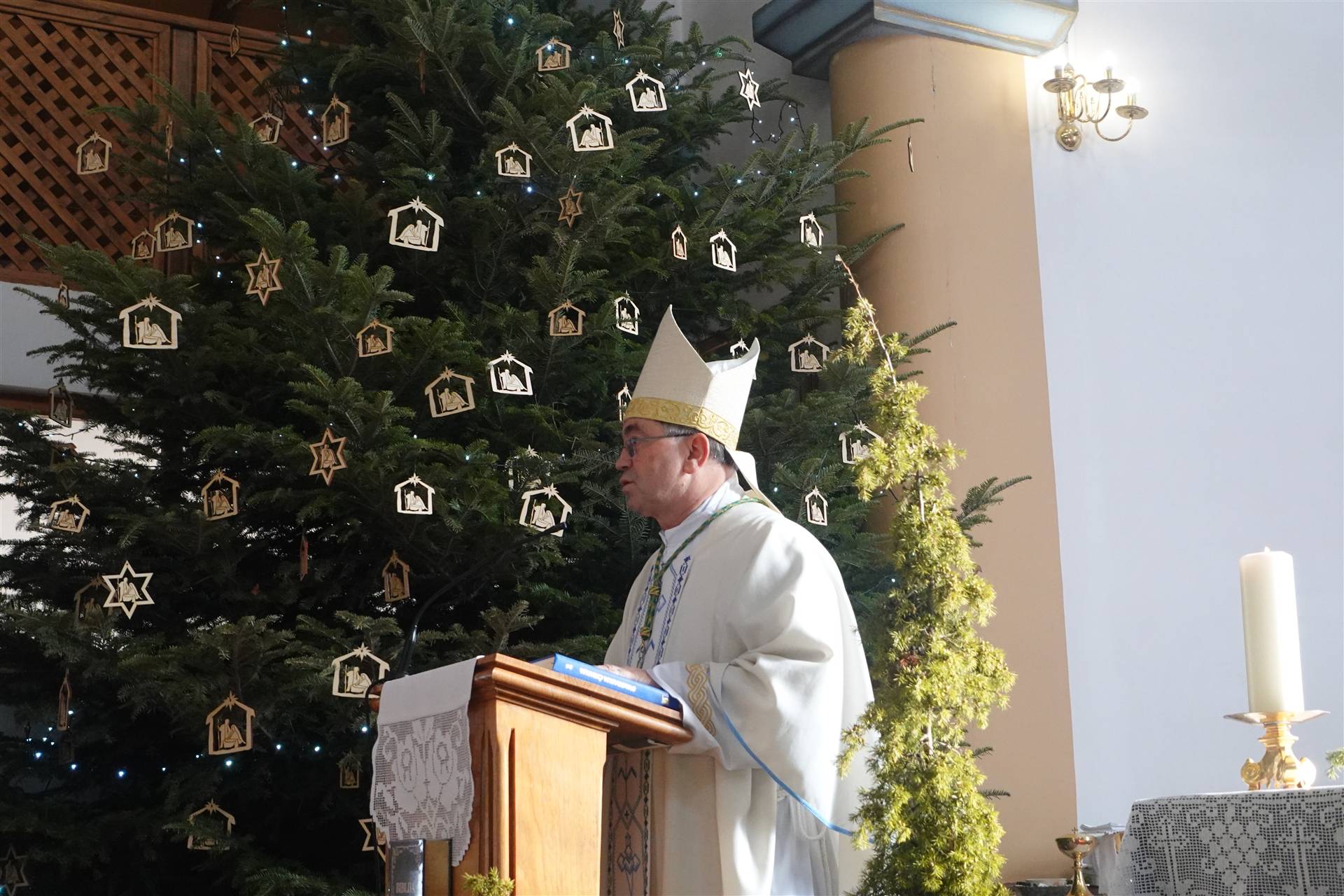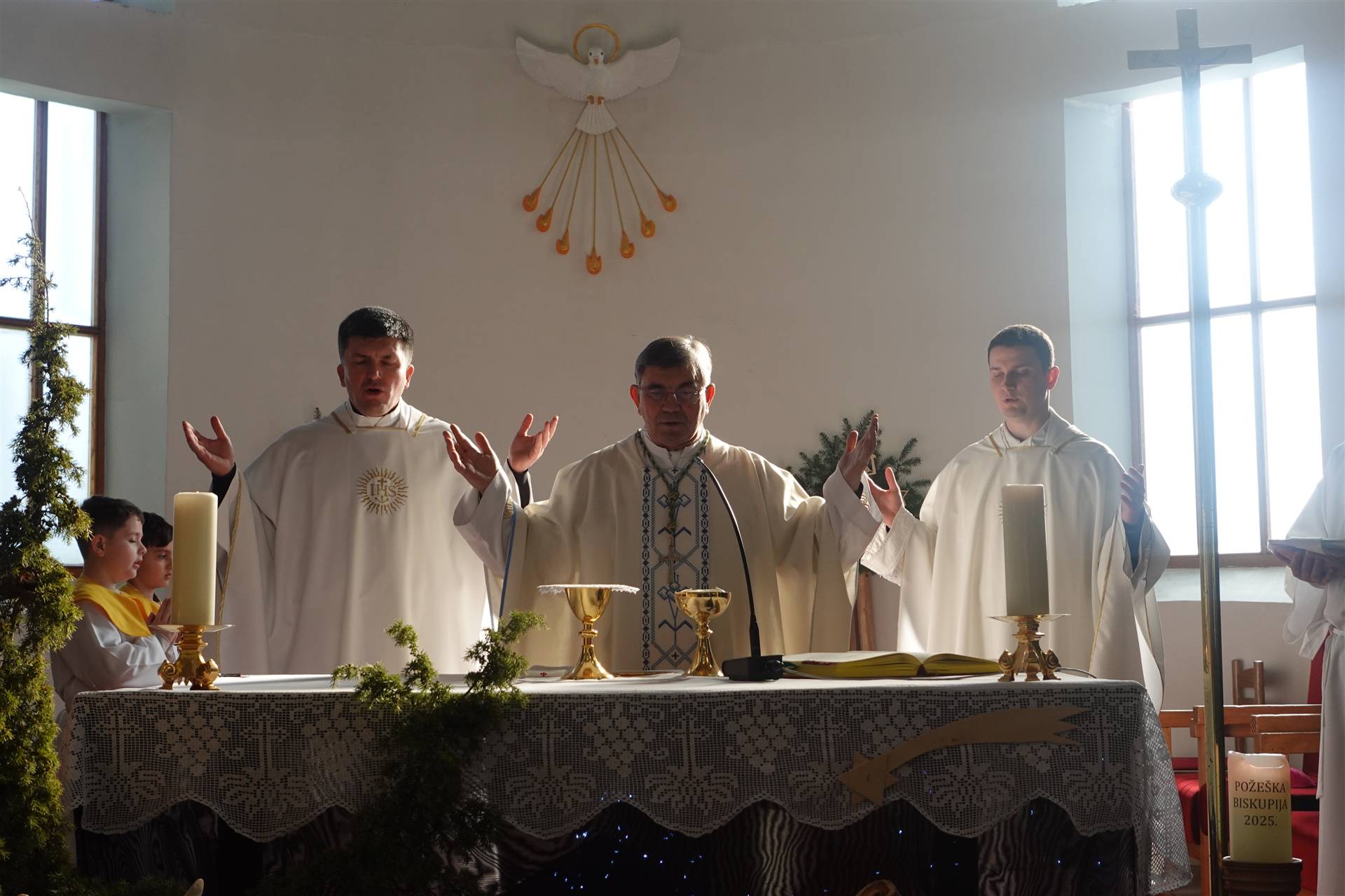 Na početku misnog slavlja biskup je vjernicima čestitao svetkovinu Isusova rođenja te istaknuo značenje Božića i sakramenta krštenja. Naglasio je kako je Božić svetkovina radosti koju „Bog donosi za svaki narod, za svaku župnu zajednicu, za svaku obitelj i za svaku osobu“. Povezujući Božić i obred krštenja, rekao je kako se Crkva posebno raduje jer se djeca po krštenju milošću Duha Svetoga nanovo rađaju i postaju djeca Božja. Uz Noela su kršteni Anđela i Antonela Đorđević, Jakov Šilarić i Fran Jozić. Biskup je pozdravio župnika Žarka Turuka, roditelje, kumove, djedove, bake i ostale članove obitelji, istaknuvši da su u tom slavlju svi okupljeni kao zajednica, kao živa Crkva koja je pozvana moliti za djecu, njihove obitelji i cijelu župnu zajednicu.