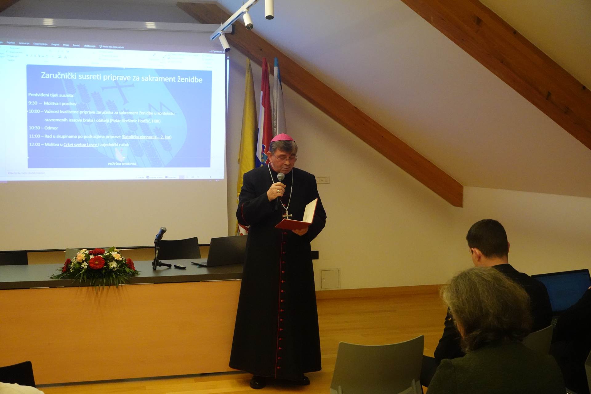 Nakon pozdrava povjerenice, nazočnima se obratio požeški biskup Ivo Martinović uputivši srdačnu riječ dobrodošlice voditeljima i suradnicima Zaručničkih susreta te gostima predavačima. Istaknuo je kako je ovaj edukacijski susret važan korak u provedbi obnovljenog modela priprave zaručnika za sakrament ženidbe na području Požeške biskupije. U svom je pozdravu podsjetio na snažan naglasak koji je Drugi vatikanski koncil stavio na brak i obitelj, osobito u konstitucijama „Gaudium et spes“ i „Lumen gentium“, te na daljnji razvoj crkvenog nauka i pastorala kroz dokumente papa Pavla VI., Ivana Pavla II., Benedikta XVI. i Franje. Biskup Martinović se osobito osvrnuo na apostolsku pobudnicu „Amoris laetitia“, u kojoj papa Franjo snažno naglašava važnost daljnje i bliže priprave za ženidbu, ističući da zaručnici ženidbu trebaju shvatiti kao cjeloživotni poziv, a ne kao završetak jednoga puta. Upozorio je kako nijedan zaručnički tečaj ne može nadomjestiti nezamjenjivu ulogu i odgovornost župnika i svećenika u pastoralnoj brizi i pripravi zaručnika za sakrament ženidbe, ali da obnovljeni model i novi priručnik koji će biti tiskan predstavljaju dragocjenu pomoć u tom poslanju.