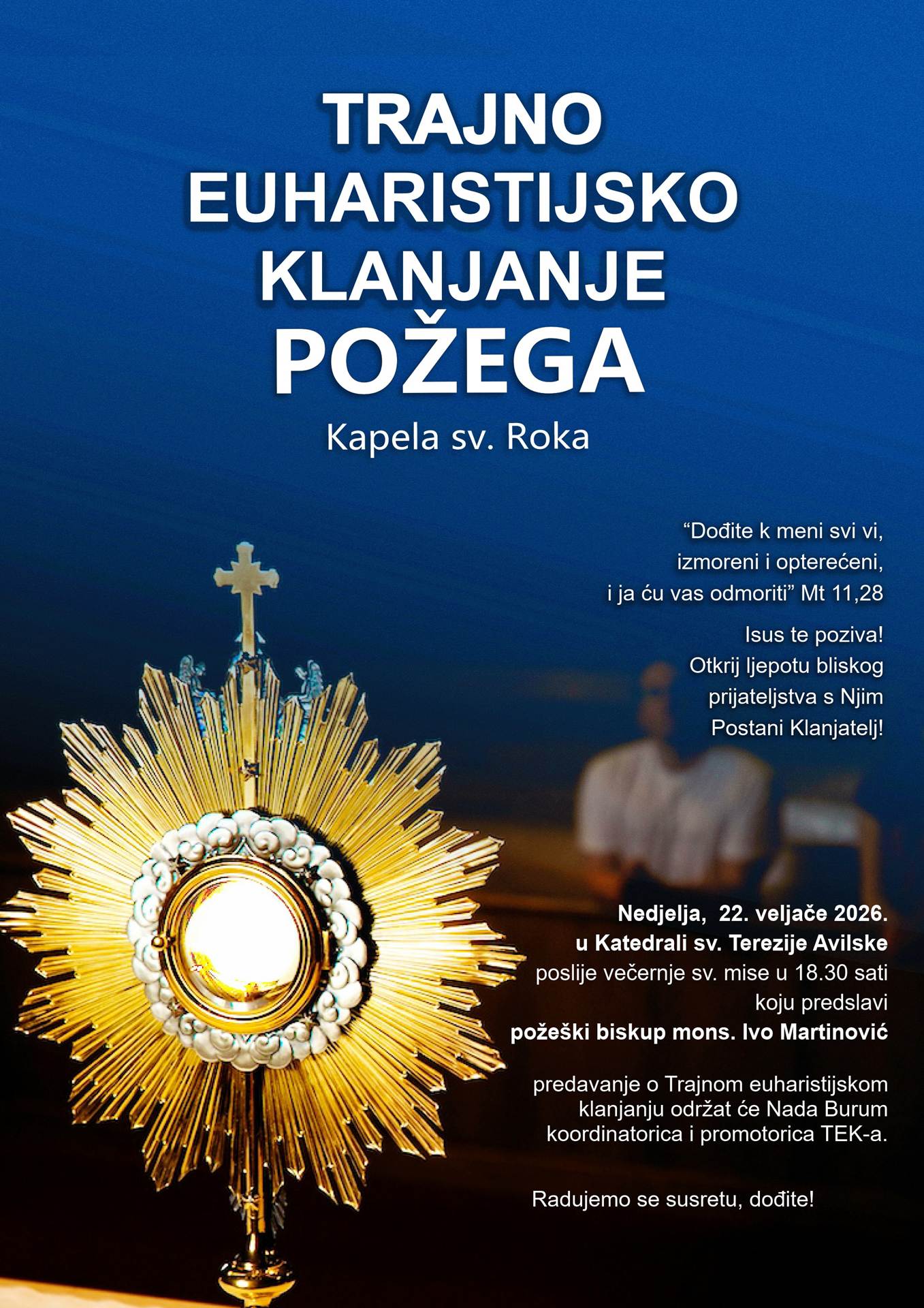 Na Prvu korizmenu nedjelju, 22. veljače 2026. godine svetom misom u našoj požeškoj Katedrali u 18.30 sati započet ćemo pripreme za uspostavu Trajnog euharistijskog klanjanja u Požegi. Nakon svete mise, nacionalna koordinatorica Trajnog euharistijskog klanjanja gđa Nada Burum progovorit će o značenju Trajnog euharistijskog klanjanja i koracima u pripravi za njegovu uspostavu. U svetoj misi su na poseban način pozvani sudjelovati svi oni koji, kao trajni klanjatelji, žele postati dionici ove inicijative.
