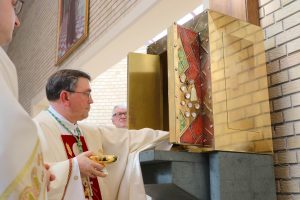 Uslijedila je molitva Litanija svih svetih te čitanje povelje posvete crkve, nakon čega je biskup pohranio relikvije bl. Stepinca u oltar u znak povezanosti s nebeskom Crkvom. Izmolio je posvetnu molitvu, moleći da Bog posveti crkvu i oltar kao mjesto žrtve i molitve. Potom je blagoslovljenim uljem pomazao oltar na pet mjesta, kao i dvanaest manjih križeva koji su postavljeni u crkvi. Na oltar su potom stavljene posude sa žarom na koji je biskup stavio tamjan koji simbolizira molitve koje se uzdižu Bogu i okadio oltar. Zatim je đakon Mislav Juraković okadio biskupa i vjernike koji čine živu Crkvu – Tijelo Kristovo. Na kraju je oltar pripremljen za slavlje mise: prekriven je oltarnikom te su postavljene svijeće i cvijeće. Župnik Jurić je od biskupa preuzeo svijeću kao simbol svjetla Kristova kojom je upalio oltarne i uskrsnu svijeću te je osvijetljena cijela crkva. Zatim su prineseni darovi za misu koja je nastavljena uobičajenim tijekom.